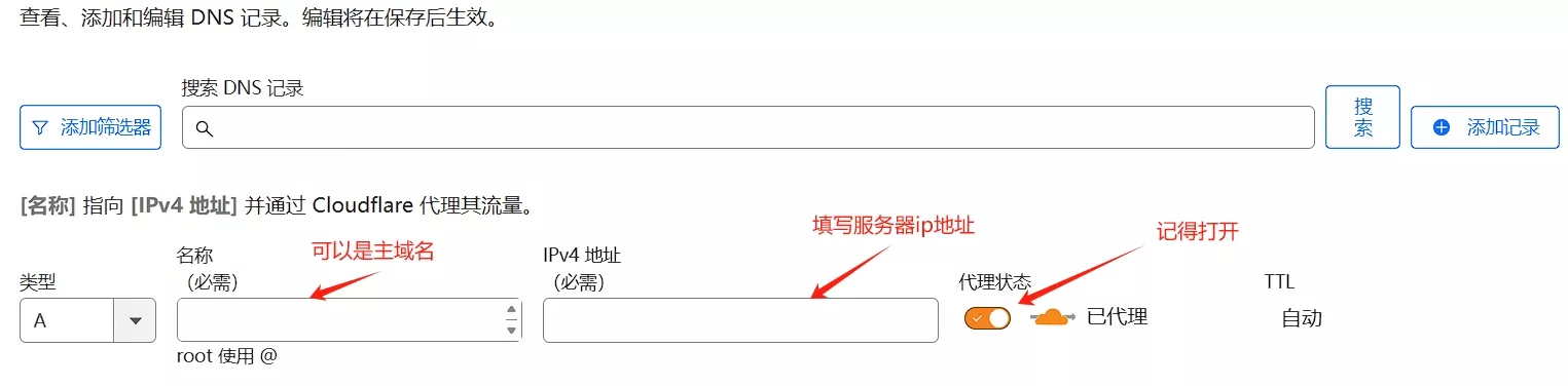 首先你需要在 cf 里解析另一个域名,这里以 example.com 举例,输入服务器 ip 地址,然后记得点开小黄云