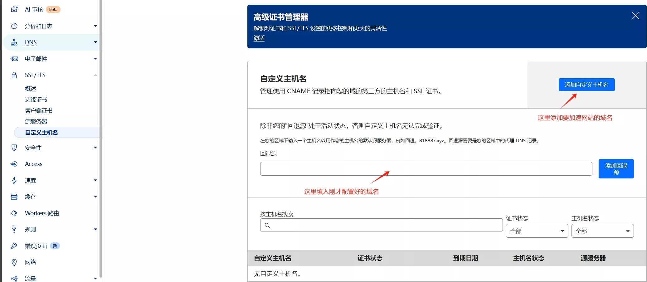 接着去添加一个主机名,这里是要配置加速的网站,将一级或二级域名完整填入。
