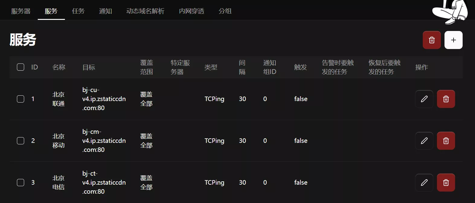 可在服务里添加本地三网监控,可在这个链接中找到本地三网对应的 tcping 地址,并添加到哪吒探针中。