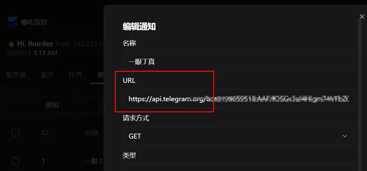 新建一条通知,名为一眼丁真,随后填写自己的通知链接,以 tg bot 通知为例,可以通过哪吒探针设置工具来进行生成。将生成的 url 链接填写到这里