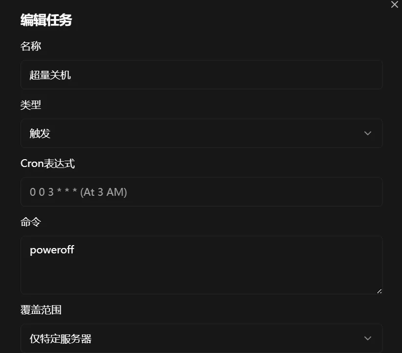 任务里添加,类型选择触发,命令为 poweroff 选择好特定机器,然后在告警规则里,触发任务选择上超量关机的这个编号即可。